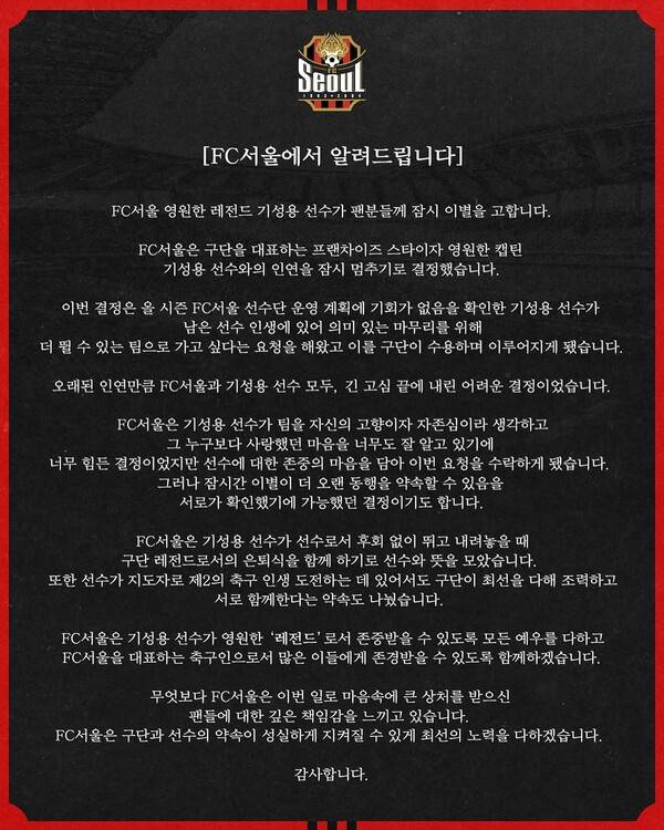 이어서 “FC서울은 구단을 대표하는 프랜차이즈 스타이자 영원한 캡틴 기성용 선수와의 인연을 잠시 멈추기로 결정했습니다. 이번 결정은 올 시즌 FC서울 선수단 운영 계획에 기회가 없음을 확인한 기성용 선수가 남은 선수 인생에 있어 의미 있는 마무리를 위해 더 뛸 수 있는 팀으로 가고 싶다는 요청을 해왔고 이를 구단이 수용하면서 이루어지게 됐습니다”라고 전했다.