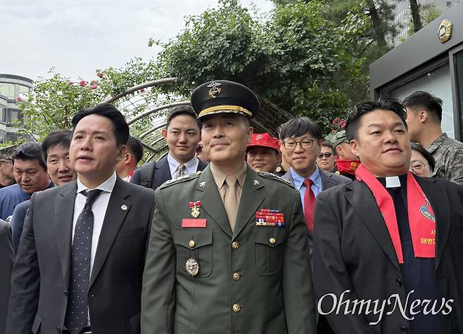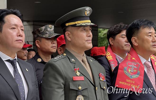 박정훈 옆에 선 해병대원들 "이 대통령님, 참군인을 복귀시키십시오"