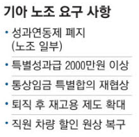 27일 기아 노조 등에 따르면 일부 조합원들은 성과연동제 폐기를 올해 임금요구안에 상정하자는 의견을 30일 임시대의원대회에서 노조 지도부에 전달할 예정이다.