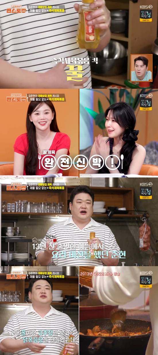 김준현은 "KBS '인간의 조건'이라는 프로그램에서 원산지에서 갖고 온 재료만 가지고 해 먹는 미션이 있었는데, 그때 꿀이랑 고추장만 넣었는데 그 닭볶음탕이 너무 맛있었다"라며 꿀을 넣는 이유를 밝혔다.