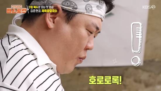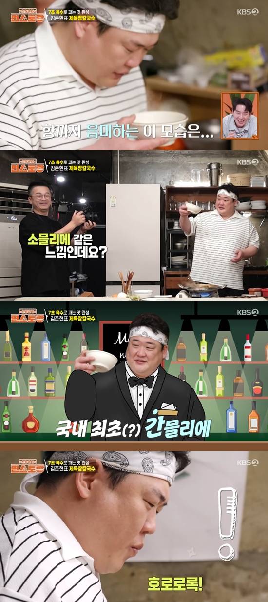 김준현은 "오늘의 (가스) 불은 꺼지지 않는다. 성화처럼 타오르고 있다"라며 끝없는 요리를 예고했다. 이어 김준현은 소믈리에처럼 간을 확인했다. 그는 "사레들릴 뻔했다. 절대 따라 하지 마셔라. 양념 된 국물로 호로록하시면 큰일난다"라며 시청자의 안전도 생각했다.