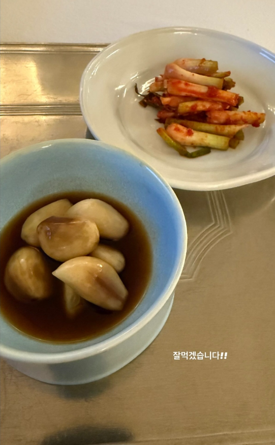 27일 고현정은 자신의 SNS를 통해 마늘 장아찌와 파김치, 계란후라이, 말린 망고 디저트로 구성된 식사를 공개했다.