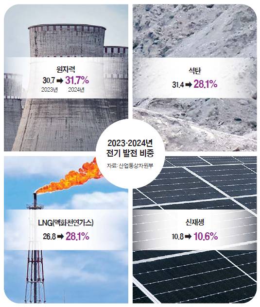 이런 가운데 AI 고속도로 공약은 물론, 당장의 전력 수급을 맞추는데도 원전은 선택이 아니라 필수라는 지적이 많다. 산업통상자원부가 발표한 ‘2024년 에너지 수급 동향’에 따르면 지난해 국내 발전 비율은 원전이 31.7%로 가장 많았다. 그 뒤는 석탄과 액화천연가스가 각각 28.1%로 뒤를 이었고, 신재생에너지는 10.6%를 차지했다. 전년도와 비교하면 원자력이 차지하는 비중은 30.7%(2023년)에서 31.7%(2024년)로 증가한 반면, 같은 기간 신재생에너지는 오히려 10.8%에서 10.6%로 감소했다.