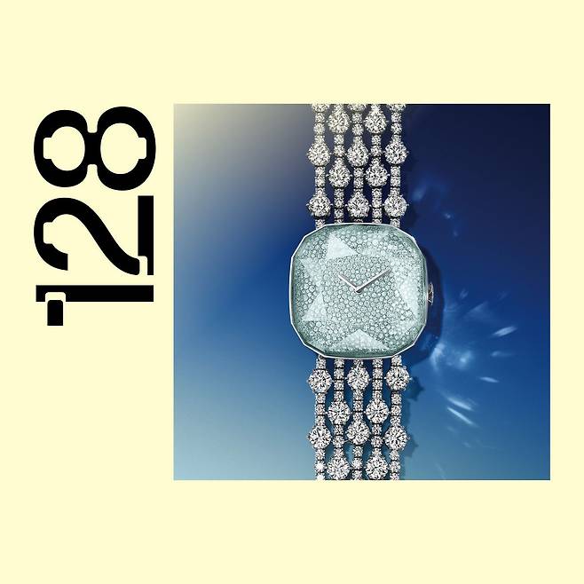 눈부신 광채에 시간을 잊을지도 모른다. 세상에 단 하나뿐인 ‘캐럿 128 아쿠아마린’ 워치는 전설적인 128.54캐럿 티파니 다이아몬드에서 영감을 얻어 탄생했다. 다이얼을 보호하는 케이스는 34.52캐럿의 싱글 다이아몬드 컷 아쿠아마린으로 제작했고, 다이얼에는 각기 다른 5가지 크기의 다이아몬드 382개(1.2캐럿)를 스노 세팅했다. 티파니의 상징 중 하나인 6개의 프롱이 다이아몬드를 지지하는 형태의 ‘티파니® 세팅’에서 착안한 브레이슬릿도 이 워치의 관전 포인트 중 하나. 여기에만 총 28캐럿, 251개의 다이아몬드를 사용해 다섯 줄의 독특한 브레이슬릿을 완성했다. 지구상 가장 유명한 다이아몬드를 재해석한 이 워치는 티파니의 상상력과 장인 정신이 빚어낸 예술 작품이라 할 수 있다.
