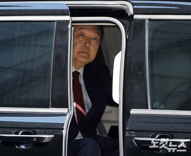 윤석열 전 대통령이 23일 오전 서울 서초구 서울중앙지방법원에서 내란 우두머리 혐의 사건 8차 공판에 출석하고 있다. 윤 전 대통령은 이날 '내란 특검팀'이 처음으로 참석하는 내란 우두머리 혐의 재판에 묵묵부답으로 출석했다. 사진공동취재단