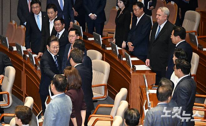 이재명 대통령이 26일 오전 서울 여의도 국회에서 열린 제426회국회(임시회) 제2차 본회의에서 2025년도 제2회 추가경정예산안에 대한 정부의 시정연설을 마치고 국민의힘 의원들과 인사를 하고 있다. 이재명 대통령의 연설이 8분 동안 이어졌고 12번의 박수가 나왔다. 국민의힘 의원들은 대부분 호응하지 않았다. 하지만 연설을 마치고 대통령이 국민의힘 의원들에게 먼저 손을 내밀자, 이내 웃으며 악수하는 모습이 포착되기도 했다. 윤창원 기자