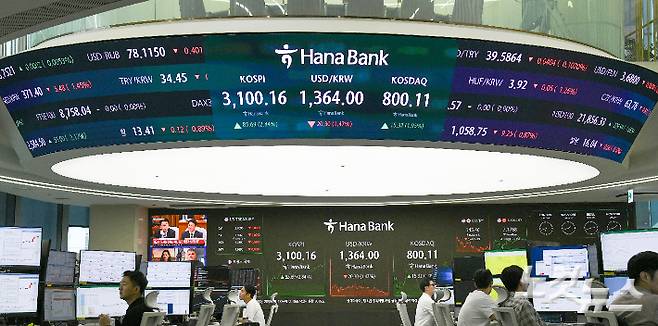 24일 서울 중구 하나은행 딜링룸 전광판에 코스피 지수가 표시되고 있다. 이날 코스피 지수는 상승 랠리를 이어가며 장중 3100선을 돌파했다. 코스닥 지수도 800선을 넘어섰다 .코스피가 3100선을 넘어선 것은 지난 2021년 9월 28일(3134.46) 이후 약 3년 9개월 만이다. 박종민 기자