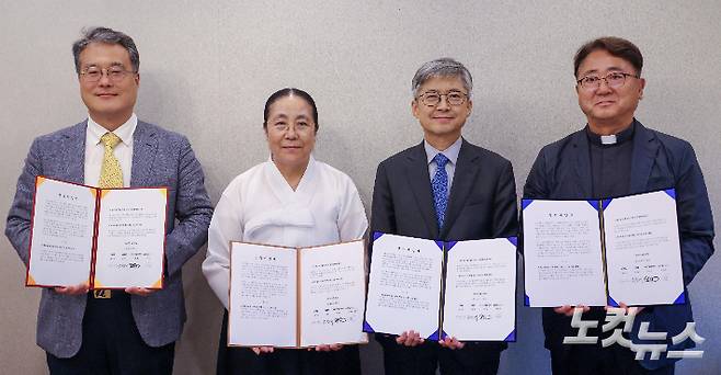 나이영 CBS 사장이 26일 서울 여의도 모처에서 열린 종교방송 사장단 정책제안서 서명식에서 서명을 마친 뒤 기념 촬영을 하고 있다. 이들은 정책제안서를 통해 "종교방송은 다종교 사회인 대한민국에서 사회적 갈등해소와 통합에 기여함으로써 건강한 여론형성을 통해 사회적 부조리를 예방하는 역할을 부단히 감당해왔다"고 강조했다. 왼쪽부터 서진영 BBS불교방송 사장, 이관도 WBS원음방송 사장, 나 사장, 조정래 CPBC가톨릭평화방송 사장. 박종민 기자