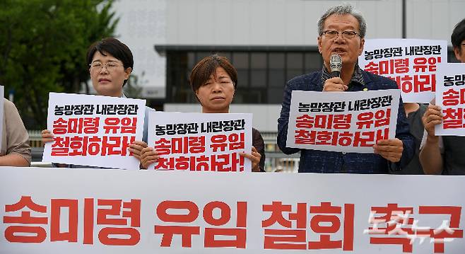 전국농민총연맹과 전국여성농민총연합이 24일 서울 용산구 대통령실 앞에서 '농망장관'·'내란장관' 송미령 유임 철회 촉구 기자회견을 하고 있다. 전국농민회총연맹(전농), 전국여성농민회총연합(전여농) 등 8개 단체가 모인 '국민과 함께하는 농민의 길'은 "송미령은 윤석열의 농업파괴·농민말살 정책을 주도한 '농망 장관'이자 12·3 내란 사태를 방조한 '내란장관'"이라고 주장했다. 박종민 기자