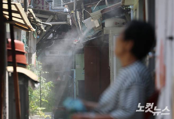 장마전선이 물러가고 무더위가 찾아온 23일 서울 영등포구 영등포쪽방촌 골골목에 폭염 대비용 쿨링포그가 가동되고 있다. 서울시는 이날 영등포 쪽방촌에서 '온기창고 3호점'(영등포구 경인로 829 1층) 개소식을 열었다. 온기창고는 매장에 후원받은 생필품을 진열해 놓고 쪽방주민 개인이 배정받은 적립금 한도 내에서 필요할 때 물품을 선택해 가져가는 방식으로 운영된다. 황진환 기자