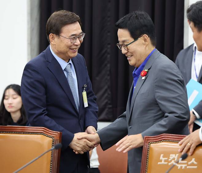 이종석 국가정보원장이 26일 서울 여의도 국회에서 열린 정보위원회 전체회의에서 박지원 더불어민주당 의원과 악수하고 있다. 이 원장은 북한이 이르면 7~8월 우크라이나와 전쟁을 벌인 러시아의 재건을 돕기 위해 6000명을 추가 파병할 것이라고 밝혔다. 윤창원 기자