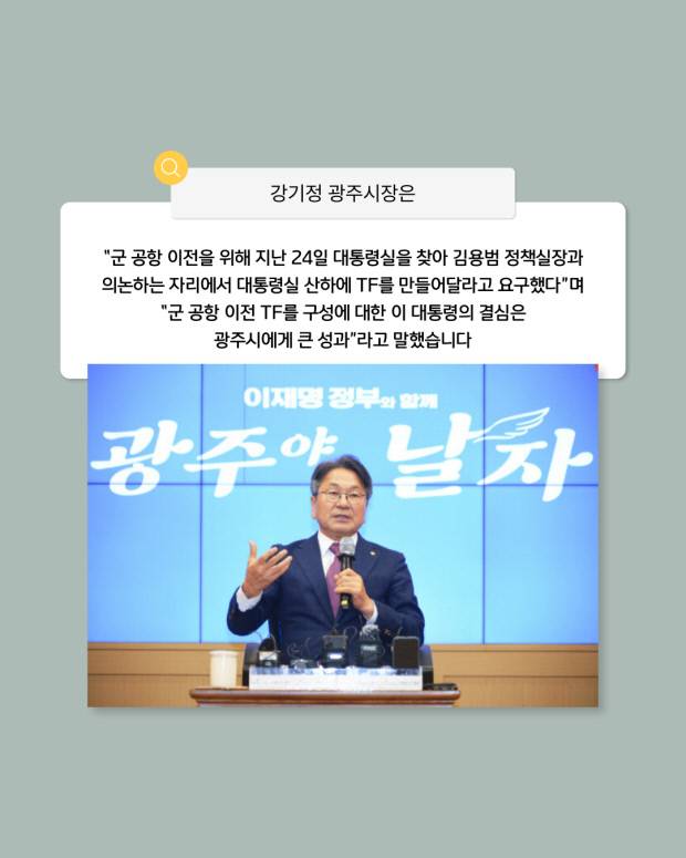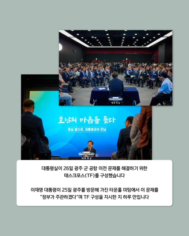 이재명 대통령이 25일 광주를 방문해 가진 타운홀 미팅에서 광주 군 공항 이전 문제를 “정부가 주관하겠다”며 TF 구성을 지시한 지 하루 만에 대통령실이 26일 태스크포스(TF)를 구성했습니다.
