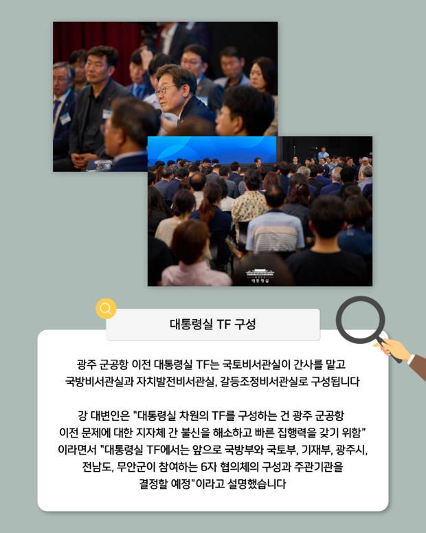 이재명 대통령이 25일 광주를 방문해 가진 타운홀 미팅에서 광주 군 공항 이전 문제를 "정부가 주관하겠다"며 TF 구성을 지시한 지 하루 만에 대통령실이 26일 태스크포스(TF)를 구성했습니다.