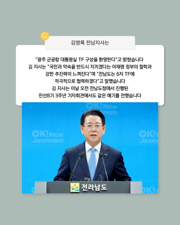 강유정 대변인은 “대통령실 차원의 TF를 구성하는 건 광주 군공항 이전 문제에 대한 지자체간 불신을 해소하고 빠른 집행력을 갖기 위함”이라면서 “대통령실 TF에서는 앞으로 국방부와 국토부, 기재부, 광주시, 전남도, 무안군이 참여하는 6자 협의체의 구성과 주관기관을 결정할 예정”이라고 설명했습니다.