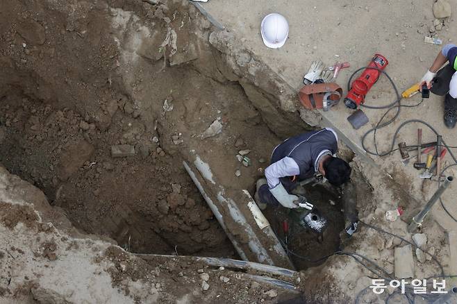 | 굴착기에 구멍 난 가스관 복구 작업 27일 오전 10시 47분경 서울 서초구 교대역 11번 출구 인근 공사 현장에서 굴착기 작업 중 도시가스 배관이 파손돼 가스가 누출되자 소방당국 관계자들이 작업장을 점검하고 있다(위쪽 사진). 사고 직후 가스가 역사 등으로 유입되면서 시민들이 대피했다. 사건 현장이 정리된 뒤 한 작업자가 구멍이 뚫린 배관을 살피며 복구 작업을 하고 있다. 뉴시스·변영욱 기자 cut@donga.com |