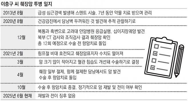 수술은 성공적으로 끝났다. 하지만 안심할 수는 없었다. 이 교수는 “췌장암은 수술 후 재발률이 60%를 웃돈다. 이 때문에 수술 후 항암치료가 필요했다”고 말했다. 그해 5월부터 다시 항암치료가 시작됐다. 한 달에 3회씩, 총 6차례 항암치료를 받았다. 수술 전 항암치료 때와 달리 당일 치료한 뒤 바로 퇴원하는 방식이었다.