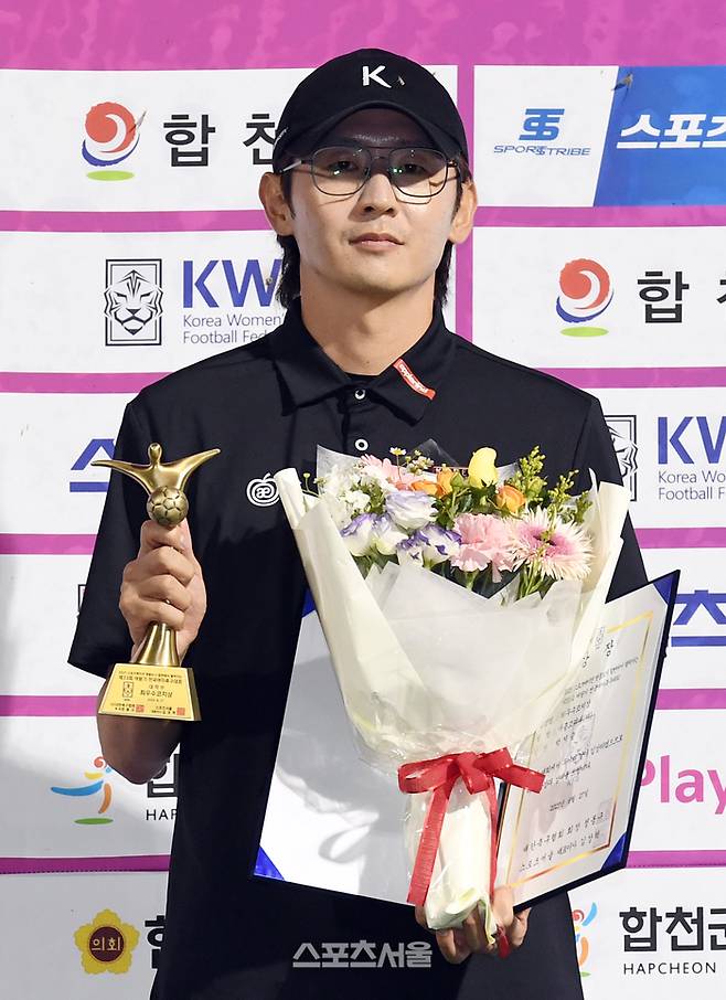 세종 고려대 박지승 코치가 27일 경남 합천에서 열린 ‘2025 스포츠케이션 명품도시 합천에서 펼쳐지는 제33회 여왕기 전국여자축구대회’ 대학부 시상식에서 최우수코치상을 수상한 뒤 기념촬영을 하고 있다. 2025. 6. 27.