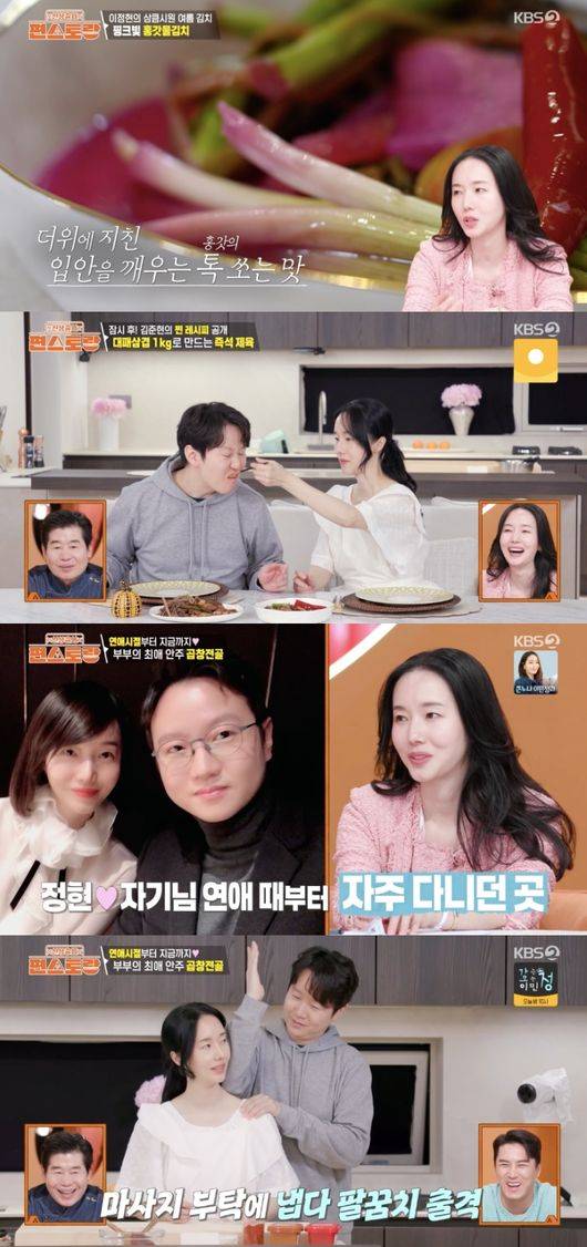 고민 끝에 남편은 ‘곱창전골’을 꼽았고, 이정현은 “저희가 가는 곱창전골 단골집이 있다. 연애할 때부터 갔던 곳이다. 시부모님 연애할 때부터 갔던 곳인데 저희도 거기서 사랑이 싹 텄다”라고 연애사를 깜짝 공개해 눈길을 끌었다.