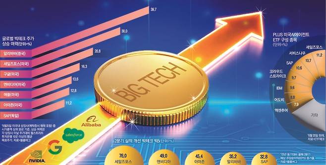 글로벌 빅테크에 분산 투자하려면 국내 상장 ETF가 대안이 된다. 마이크로소프트 AI 서비스 ‘코파일럿’에 물어보니 ‘PLUS 미국AI에이전트’ ETF를 답으로 내놨다. 이날 현재 구성 종목으로 세일즈포스(11.2%) SAP(10.6%) 등을 비중 있게 담고 있다. 국내 상장 ETF이므로 연금저축펀드 등 절세 계좌에 투자할 수 있다.