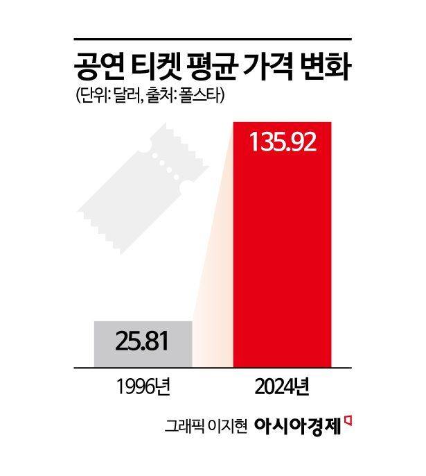 해외도 상황은 비슷하다. 1996년 미국 상위 100개 투어의 평균 티켓 가격은 25.81달러(약 3만 5000원)로, 공연 전문 매체 폴스타는 이를 현재 물가 기준 약 52달러(약 7만원) 수준으로 추산했다. 그러나 지난해에는 평균 135.92달러(약 18만 5000원)까지 치솟았다.