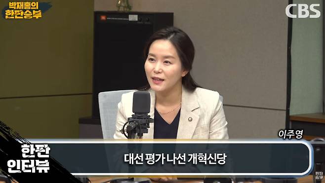◆ 이주영> 개혁신당에 대해서 좋게 봐주시는 것 같아서 정말 감사한데 제가 생각하기엔 그렇습니다. 개혁신당은 작은 물잔에 든 깨끗한 물이고요. 국민의힘은 큰 물병에 들어 있기는 하지만 아직 어느 정도는 정수할 필요가 있는 상황이라고 생각합니다. 그 둘이 정말 올바른 정치를 위해서 합치려면 정수가 먼저 선행되어야 하는 것이고 그렇지 않은 상태에서는 합치는 것을 전제로 두고 이야기하는 것 자체가 작지만 깨끗한 물인 저희 입장에서는 아직은 받아들이기는 어려운 부분이 있다 이렇게 말씀드리고 싶습니다.