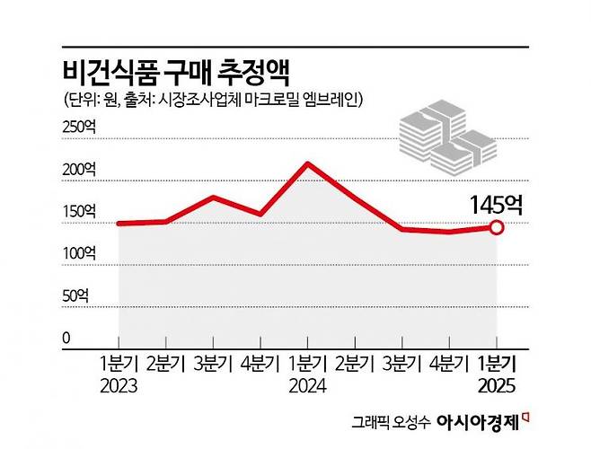 28일 시장조사기업 마크로밀 엠브레인에 따르면 코로나19 팬데믹 이후 지속 가능한 먹거리로 주목받았던 '비건 식품' 시장이 최근 정체 국면에 접어든 것으로 나타났다. 대형마트와 편의점 등에서 판매된 비건 식품 구매 추정액은 2023년 초부터 가파른 증가 추이를 보였고, 지난해 1분기에 정점을 찍어 총 220억원을 기록했다. 하지만 이후 점차 하락세를 보이며, 지난해 4분기에는 구매액이 139억원으로 크게 줄어들었고, 올해도 1분기 145억원으로 전년 동기 대비 34.1% 감소하는 등 비건 식품에 대한 수요가 줄어들고 있는 모습이 확인됐다.