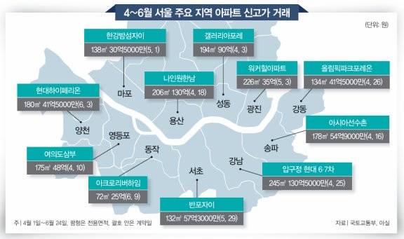 최근 서울 아파트 '불장' 중심에 있는 성동구에서 6월 25일 만난 부동산공인중개사들은 최근 부동산시장 상황을 이렇게 말했다. 기자가 이날 찾은 e편한세상옥수파크힐스와 래미안옥수리버젠은 성동구의 대표 아파트 단지다. 성수동이 서울에서 수위를 다투는 주거지로 변모하기 전까지 옥수동은 아파트가 밀집된 성동구의 핵심 주거지였다. 지금도 성수동 초고가 아파트인 갤러리아포레, 트리마제 등을 제외하면 성동구 아파트 가격 상위권을 유지하고 있다.최근 서울 아파트 가격이 무섭게 뛰고 있다. 한국부동산원에 따르면 6월 셋째 주 서울 아파트 매매 가격은 전주보다 0.36% 상승해 2018년 9월 이후 6년 9개월 만에 최고치를 기록했다. 구별로 보면 성동구 아파트 가격이 0.76% 올라 상승폭이 가장 컸다. 2013년 4월 이후 약 12년 2개월 만에 최대 폭이다. 그 뒤를 강남구(0.75%)와 송파구(0.70%), 강동구(0.69%), 마포구(0.66%)가 이었다. 같은 기관의 6월 넷째 주 통계에서 서울 아파트 가격은 전주 대비 0.43% 올라 최대 상승률 기록을 다시 갈아치웠다. 이 주에도 성동구(0.99%)와 마포구(0.98%) 등 한강벨트 지역의 아파트값 상승폭은 역대 최고치를 기록했다. 이 같은 통계를 입증하듯이 집값 상승폭을 키운 지역을 중심으로 아파트 신고가 행렬이 이어지고 있다(지도 참조). 서울 아파트 가격 급등은 최상급지 초고가 단지에서 시작해 각 지역으로 파급되는 양상이다. 최근 재건축 대장주인 압구정 현대 6·7차 245㎡가 130억5000만 원 신고가를 기록했고, 하이엔드 아파트의 대표주자인 나인원한남 206㎡는 130억 원으로 최고가를 찍었다. 토지거래허가구역 규제에도 강남 3구와 용산구 집값이 폭등하자 한강벨트 다른 지역에서도 대장 아파트를 중심으로 가격이 상승하고 있다.