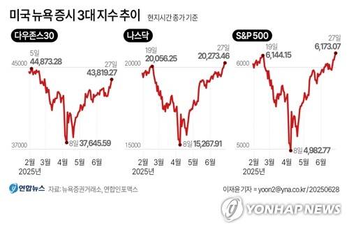 (서울=연합뉴스) 이재윤 원형민 기자 = 뉴욕증시가 도널드 트럼프 미국 대통령의 관세 정책 충격에 따른 하락을 모두 회복하고 4개월 만에 사상 최고치를 경신했다.