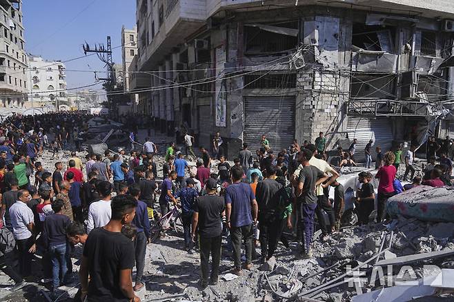 [가자시티=AP/뉴시스] 27일(현지 시간) 가자지구 가자시티에서 팔레스타인 주민들이 이스라엘의 공습으로 파손된 주거 건물 주변에 모여 있다. 2025.06.27.
