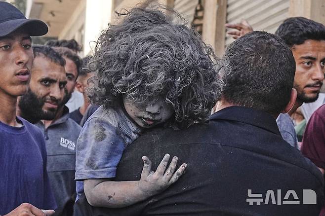 [가자시티=AP/뉴시스] 27일(현지 시간) 가자지구 가자시티에서 한 팔레스타인 남성이 이스라엘의 공습으로 부상한 아이를 안아 대피시키고 있다. 2025.06.27.