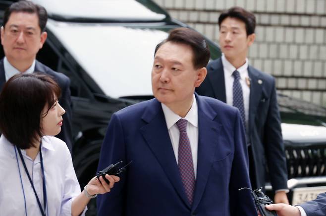 [윤석열 전 대통령이 16일 서울 서초구 서울중앙지방법원에서 열린 내란 우두머리 혐의·직권남용 권리행사 방해 혐의 사건 7차 공판에 출석하고 있다. (사진=연합뉴스)]