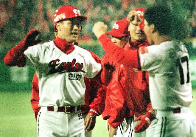 | ▲ 1999년 10월 26일 대전 한밭야구장에서 열린 프로야구 한국시리즈 한화와 롯데의 경기에서 6회말 외야플라이로 역전타점을 올린 한화 장종훈 선수가 홈에서 팀 동료들과 함께 기쁨을 나누고 있다. |