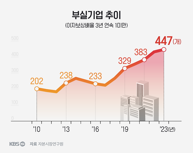 3년 연속 1 미만인 기업이 2010년 202곳에서 2023년 447곳으로 늘었습니다.