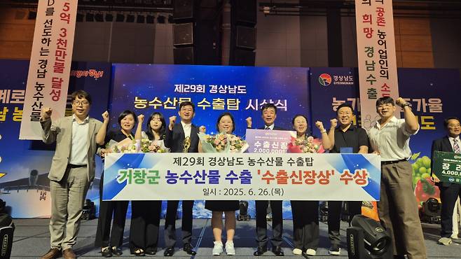 거창군은 지난 26일 창원컨벤션센터에서 열린 제29회 경상남도 농수산물 수출탑 시상식에서 농수산물 수출 시책 평가에서 3년 연속 수출 우수 시군으로 선정 ‘수출신장상’을 수상하는 영예를 안았다.