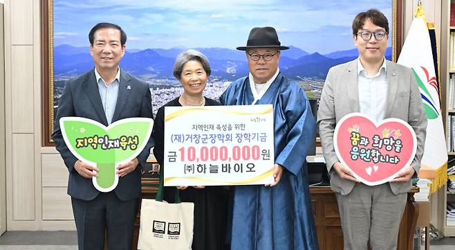 남상면에 위치한 전통 부각 제조 기업 ㈜하늘바이오 농업회사법인(대표 윤효미)는 지역 학생들의 교육환경 개선과 인재 육성에 기여하고자 영업 수익 일부인 1000만원을 거창군장학회에 기탁했다.