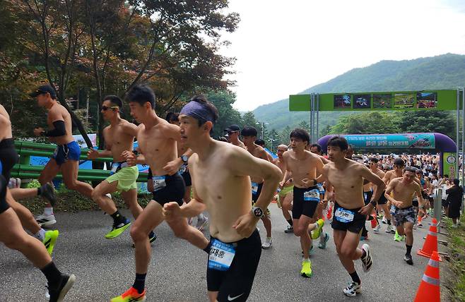 상의를 벗은 남성 참가자들 민소매·반팔 티셔츠를 입은 여성 참가자들은 5㎞(1시간 제한) 코스와 10㎞(2시간 제한) 코스를 선선한 숲속 바람을 온전히 느끼며 레이스를 펼쳤습니다.