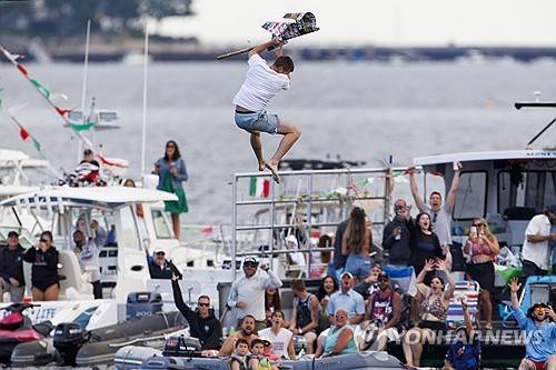 epaselect epa12202134 Winning competitor Jospeh Klyce falls with the flag at the end of the 'Greasy Pole,' a part of the sporting activities of the city wide celebrations of St.Peter's Fiesta in Gloucester, Massachusetts, USA, 27 June 2025. St. Peter's Fiesta is an annual celebration started in 1927, taking place on the weekend closest to the Feast Day of St. Peter, 29 June, and is sponsored by the Italian-American fishing community of Gloucester. Gloucester, Massachusetts is home to America's oldest seaport and continues to be an important center of the fishing industry. EPA/CJ GUNTHER