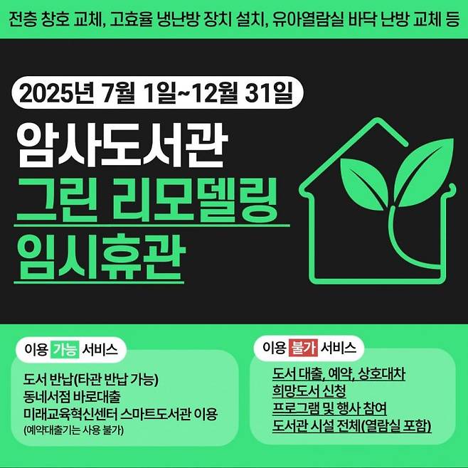 암사도서관은 국토교통부에서 주관하는 '2025년 공공건축물 그린리모델링 지원사업' 공모에 선정돼 에너지 효율성 개선과 온실가스 감축, 탄소중립을 목표로 하는 친환경 리모델링 지원사업을 진행한다. 리모델링에는 국비와 지방비 총 15억원이 투입된다.