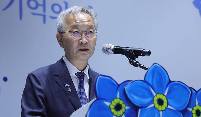 ▲ 28일 오전 경기도 파주시 임진각에서 열린 제1회 6·25 전쟁 납북자 기억의 날 기념식에서 김남중 통일부 차관이 기념사하고 있다.