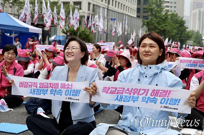 이들은 새정부에 대해 "학교부터 비정규직 저임금 구조 개선하고 임금차별 철폐하라", "임금체계 개편 약속 이행을 위해 정책과 예산을 수립하라", "학교 급식실이 민생현장이다. 학교 급식 노동 위기 대책 마련하라", "학교 급식실이 비어간다. 학교 급식실 폐암 산재 근본 대책 마련하라", "방학 중 무임금은 현대판 보릿고개. 학교 비정규직 저임금 구조 해결하라"라고 촉구했다.