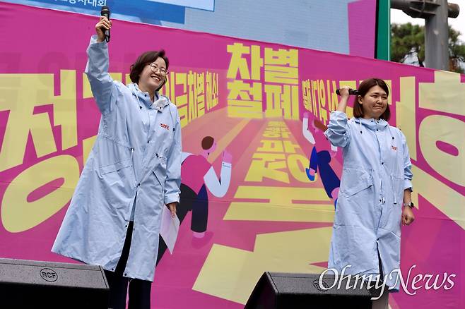 | ▲ 28일 서울 숭례문 앞에서 열린 전국학교비정규직노동자대회. 진보당 정혜경, 손솔 국회읜원. |