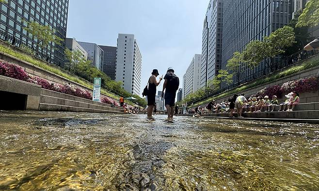 방탄소년단 콘서트를 보기 위해 한국을 찾은 호주인 챈털 조지프(Chantelle Joseph)가 남편 제임스 와데이(James Wah Day)와 함께 청계천을 방문한 날은 마침 발을 물에 담글 수 있는 행사가 진행 중이었다. 본격적인 장마를 앞두고 괜찮은 초여름 햇살이 비친 날이기도 했다. 30도에 가까운 날씨 속 차가운 청계천 물속 걷기는 이들에게 도심 속 색다른 경험을 선사했다.