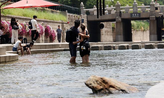 방탄소년단 콘서트를 보기 위해 한국을 찾은 호주인 부부가 청계천에 발을 담그고 물살을 느끼고 있다. 부부가 찾은 이날은 상류 일부 구간을 공개하는 ‘청계천 물 첨벙첨벙’ 행사가 진행 중이었다.