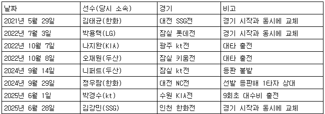 2021년 5월 29일 대전 SSG전에서 김태균(한화) KBSN스포츠 해설위원이 KBO리그 처음으로 특별 엔트리에 등록돼 선발 라인업에 포함됐다.