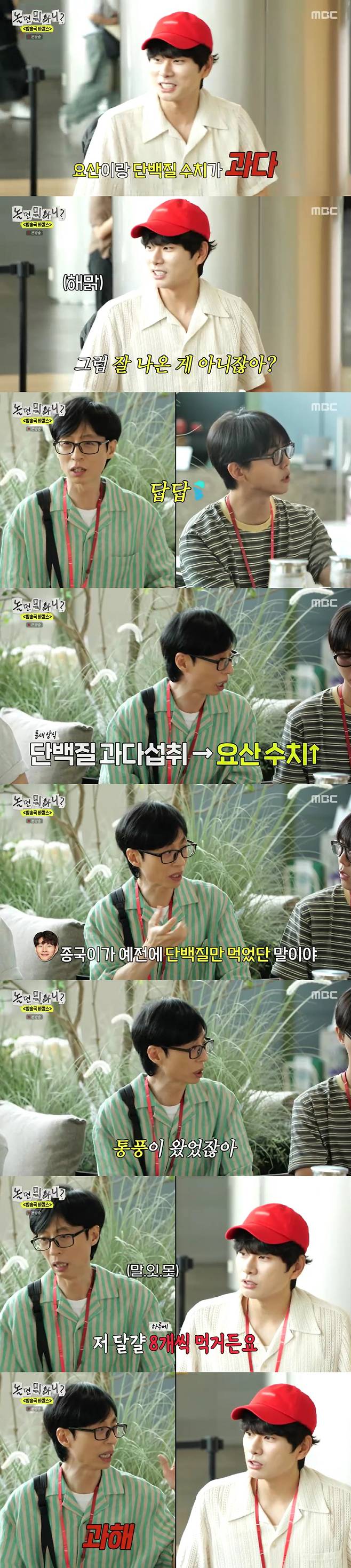 이를 들은 유재석은 "단백질을 너무 많이 먹으면 요산이 올라간다. 요산이 높으면 통풍이 온다. 종국이가 예전에 탄수화물 안 먹고 단백질만 먹다 통풍 왔었다"며 걱정을 드러냈다.