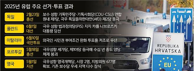 포르투갈의 극우정당 셰가(CHEGA!)는 지난달 18일 총선에서 전체 230석 중 60석을 확보해 제1야당에 올랐다. 이는 수십 년간 중도 진보·중도 보수당이 번갈아 집권하던 양당 체제의 붕괴를 의미하는 것이기도 했다. 영국에서는 극우 성향의 영국개혁당이 지난달 1일 지방선거에서 시장 2명, 지방의원 677명을 확보하는 등 기존 보수당의 우세 지역을 다수 잠식했다. 우익·민족주의 성향의 조르자 멜로니 총리가 집권하고 있는 이탈리아에서는 지난 8일 시민권 취득 요건 완화 여부를 묻는 국민투표가 열렸으나 투표율은 29%에 머물렀다. 투표 결과가 법적 구속력을 갖기 위해서 50%를 넘어야 하지만 그렇지 못했다.