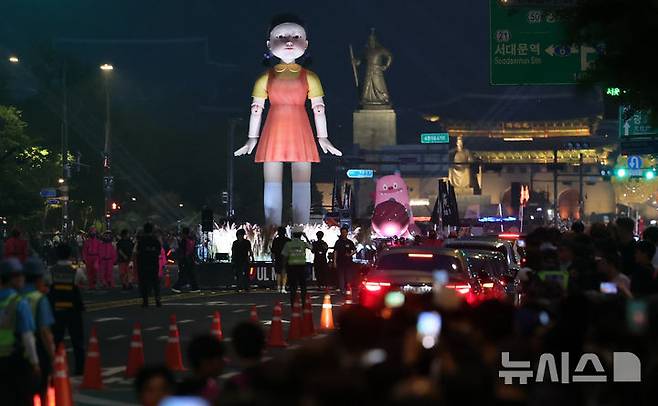 [서울=뉴시스] 권창회 기자 = 28일 서울 중구 서울시청 인근에서 2025 K콘텐츠 서울여행주간 오징어게임 퍼레이드 행사가 열리고 있다. 2025.06.28. kch0523@newsis.com