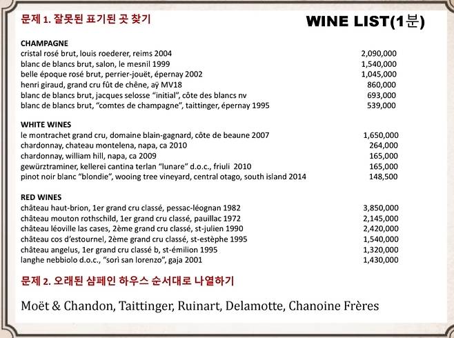 다섯 번째 마지막 문제는 주어진 와인리스트에서 잘못된 정보를 찾아내는 것으로 총 17종의 와인 중 3가지 잘못된 정보의 와인을 맞추고, 오래된 샴페인 하우스를 순서대로 나열하는 문제입니다. 주어진 시간은 불과 1분이라 평소 많은 와인에 대한 정보를 충분히 익히고 있지 않다면 풀기 어려운 문제입니다.