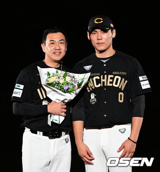 김강민이 SSG 윤태현과 기념촬영을 하고 있다. 2025.06.28 / ksl0919@osen.co.kr