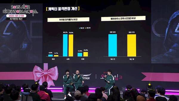 캐릭터 피격 판정 개선: 20년 만에 허벅지 관통이 수정됐다. 업데이트 후 피격률을 살펴보니 개선 전보다 하체 피격률이 3% 정도 올랐다. 웨어하우스 전투 시간의 경우 5초 정도 줄었다. 김 디렉터는 전반적으로 긍정적인 결과라고 전했다.